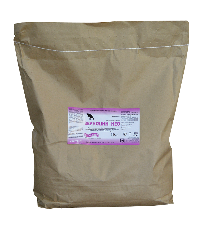 Средство родентицидное «ЗЕРНОЦИН НЕО» (далее по тексту - средство) представляет собой готовую к применению отравленную приманку в виде гранул красно-коричневого цвета. Допускается использование пищевых привлекателей. В состав средства входят краситель и горечь-битрекс, необходимые для предотвращения случайного отравления людей. В качестве действующего вещества (ДВ) содержит бромадиолон - (3-[3-(4'-Бромобифенил-4-ил)-3-гидрокси-1-фенилпропил]-4-гидроксикумарин) - 0,005%. Средство предназначено для борьбы с серыми и черными крысами, домовыми мышами, полевками, другими мышевидными грызунами профессиональным контингентом в практике медицинской дератизации и населением в быту. Средство применяют на застроенных и не застроенных территориях населенных пунктов на объектах различных категорий, в том числе промышленных, пищевых, в жилых помещениях, детских (в местах, недоступных детям или в отсутствие детей, за исключением спален и игровых комнат) и лечебных учреждениях (в том числе палаты ЛПУ в периоды отсутствия больных),на складах хранения сельскохозяйственной продукции,а также в очагах природно-очаговых инфекций.