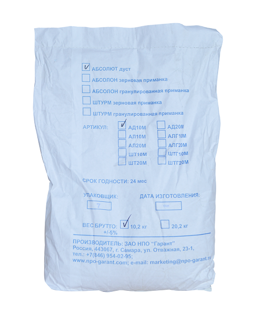 Инсектоакарицидное средство "Абсолют-дуст" представляет собой дуст от светло-серого до светло-коричневого цвета. Действующими веществами его являются: пиретроид дельтаметрин - 0,02% и представитель ФОС - фентион - 0,25%. В его состав входит масло смазочное, предотвращающее пыление, и наполнители.