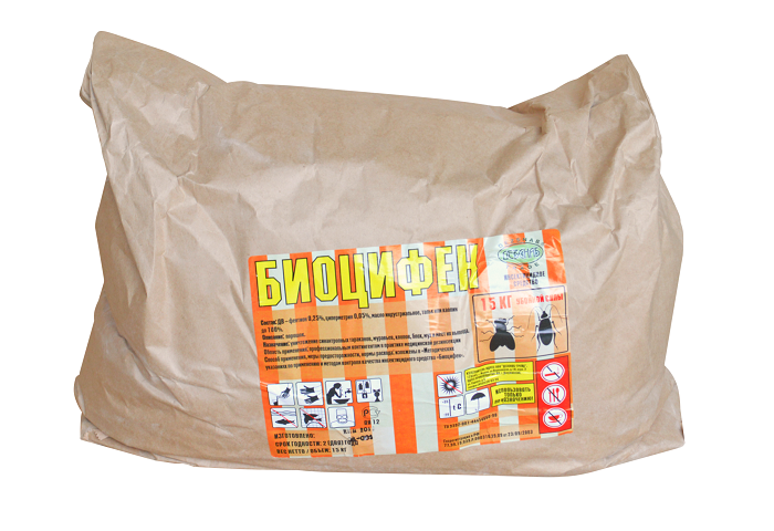 Инсектицидное средство "Биоцифен" фирмы ООО "Биор" (Россия, Москва) представляет собой дуст от свет­ло-серого до светло-коричневого цвета, содержащий в каче­стве действующего вещества фентион в количестве 0,25% и циперметрин - 0,05%. Выпускается в упаковках из двойного полиэтилена по 50-300 г для быта и по 5-10-20 кг в крафт-мешках для дезорганизации. Срок годности 2 года. Средство "Биоцифен" обладает острым инсектицид­ным действием в отношении тараканов, муравьев, клопов, блох и мух и остаточным действием в течение 4-8 недель. Средство "Биоцифен" предназначено для уничтоже­ния тараканов, муравьев, клопов, блох, мух профессиональ­ным контингентом в практике медицинской дезинсекции и на­селением в быту на объектах различных категорий.