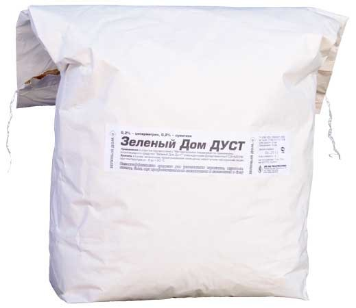 Инсектицидное средство "Зеленый дом-дуст" (НП ЗАО "Росагросервис", Россия, Москва) представляет собой дуст от светло-серого до светло-бежевого цвета. Действующим веществом его является пиретроид циперметрин – 0,2% и представитель ФОС – сумитион – 0,2%. В его состав входят также наполнители.