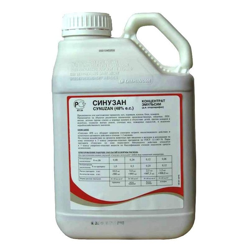«Синузан» 48% концентрат (к.э.) эмульсии представляет собой жидкость от светло-желтого до коричневого цвета, с характерный запахом содержащий в качестве ДВ хлорпирифос (48%), а также растворитель, эмульгаторы до 100%. Срок хранения 3 года. Выпускается в пластиковых канистрах объемом по 5 и 20 л. «Синузан» 48% к.э., обладает широким спектром инсектицидного действия, в отношении рыжих и черных тараканов, мух, блох, постельных клопов, комаров. Длительность остаточного действия до 1 месяца. «Синузан», предназначен для борьбы с рыжими и черными тараканами, мухами, блохами, постельными клопами и комарами (имаго) на объектах различного назначения: производственные, пищевые, ЛПУ (кроме палат), жилые в отсутствии людей, детские (кроме спален и игровых, комнат) в отсутствии детей, а также против комаров (личинки) в водоемах: подвалов жилых домов, сточных вод, пожарных ёмкостей, в водоёмах нерыбохозяйственного значения.